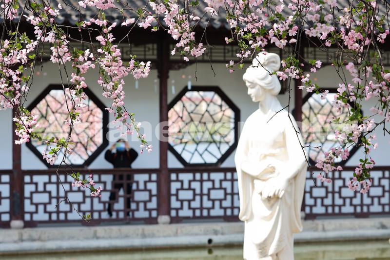 2023年3月16日,游人在南京莫愁湖公园赏花拍照。近日,南京莫愁湖公园海棠花盛开,园内处处花红柳绿,一派春意盎然。