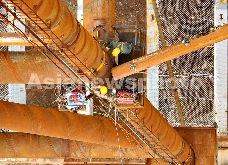 图片说明:2023年3月16日,江西省赣州蓉江新区创业大桥项目施工地,工人在焊接安装钢结构梁拱箱梁。
