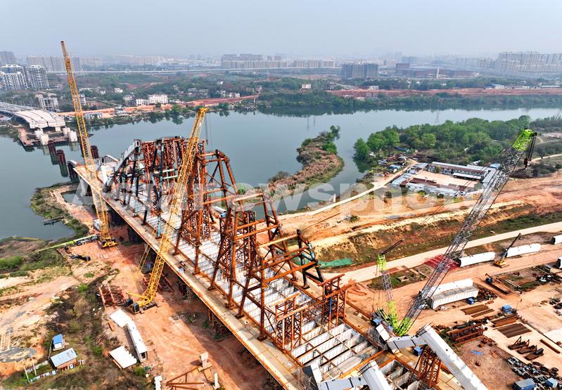 图片说明:2023年3月16日,江西省赣州蓉江新区创业大桥项目施工地,工人在焊接安装钢结构梁拱箱梁。