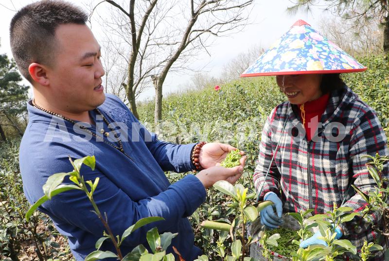 图片说明:3月16日,苏州市东山镇陆巷村母子茶农在茶园采摘明前碧螺春新茶。