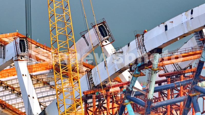 图片说明:2023年3月16日,江西省赣州蓉江新区创业大桥项目施工地,工人在焊接安装钢结构梁拱箱梁。