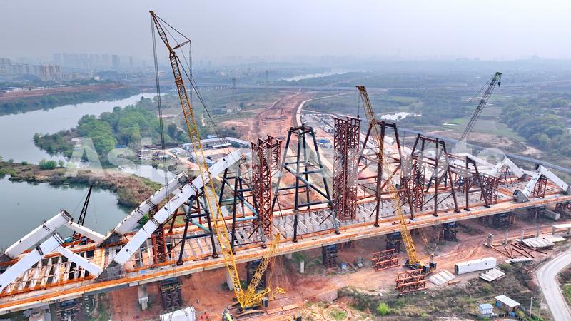 图片说明:2023年3月16日,江西省赣州蓉江新区创业大桥项目施工地,工人在焊接安装钢结构梁拱箱梁。