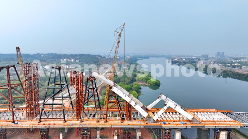 图片说明:2023年3月16日,江西省赣州蓉江新区创业大桥项目施工地,工人在焊接安装钢结构梁拱箱梁。