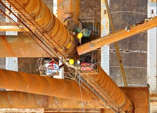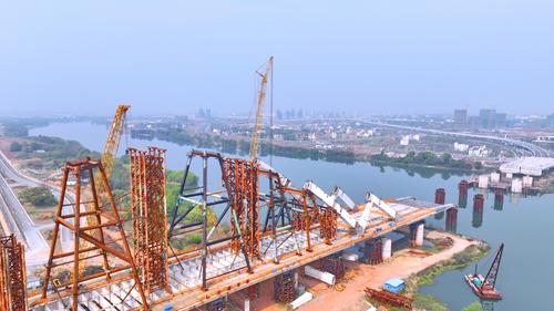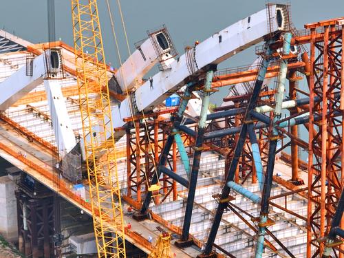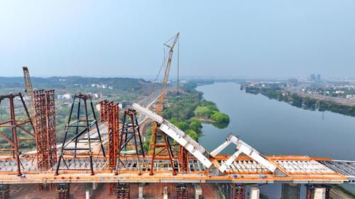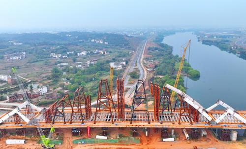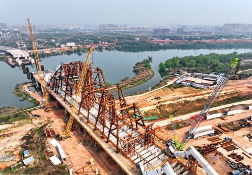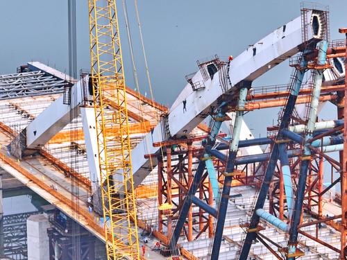图片说明:2023年3月16日,江西省赣州蓉江新区创业大桥项目施工地,工人在焊接安装钢结构梁拱箱梁。
