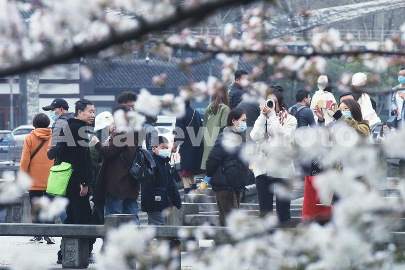 图片说明:2023年3月19日,游客观赏杭州西湖边盛开的樱花。