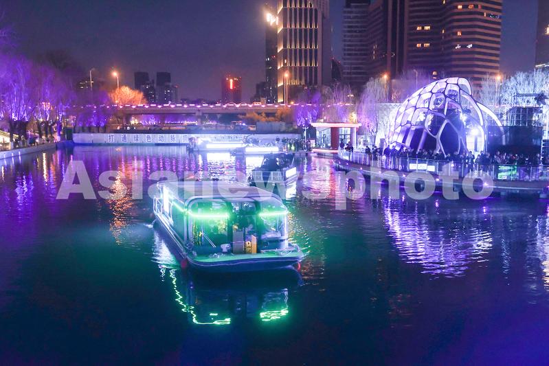 2023年3月18日晚,游船行驶在北京亮马河上。