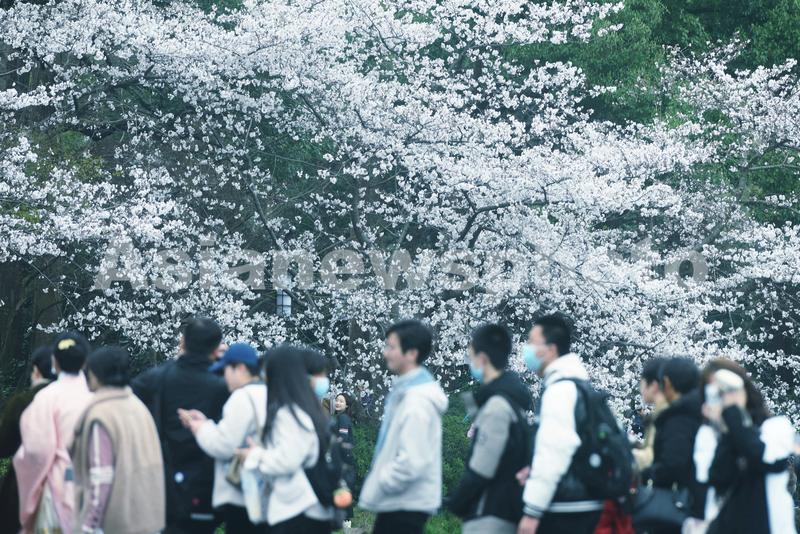 图片说明:2023年3月19日,游客观赏杭州西湖边盛开的樱花。