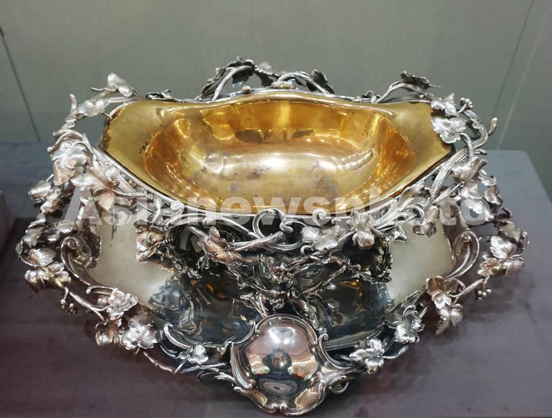 2023年3月18日,在“西方18-20世纪银器展”上拍摄到的法国《银镀金花盆》。