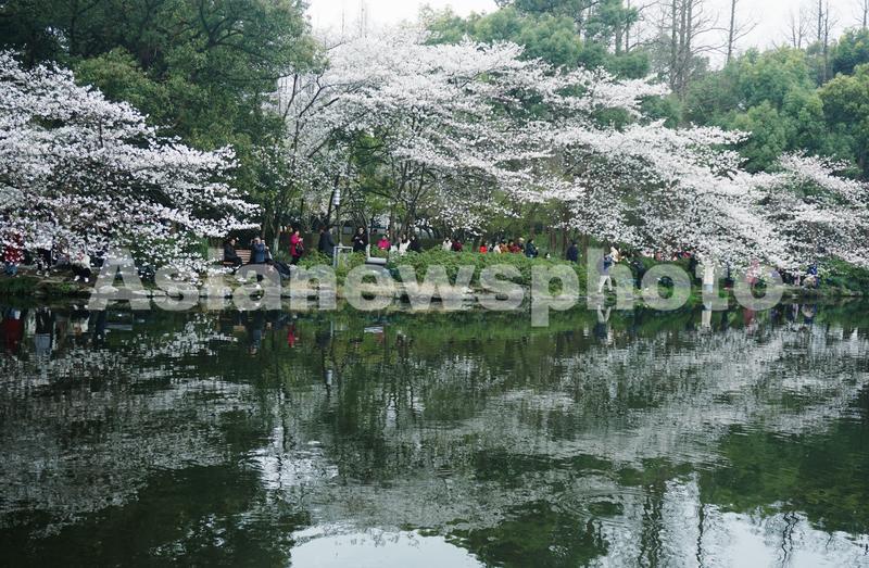图片说明:2023年3月19日,游客观赏杭州西湖边盛开的樱花。