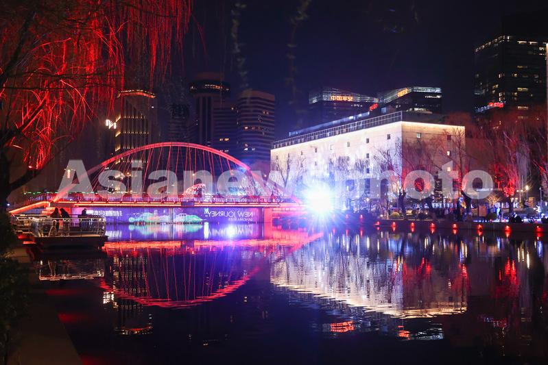 2023年3月18日晚,在北京亮马河畔拍摄的夜景。