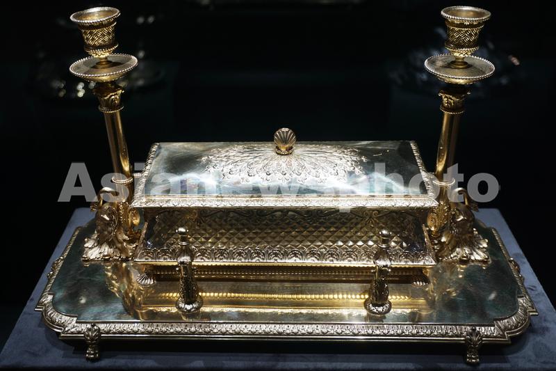 2023年3月18日,在“西方18-20世纪银器展”上拍摄到的法国《银镀金墨水架》。