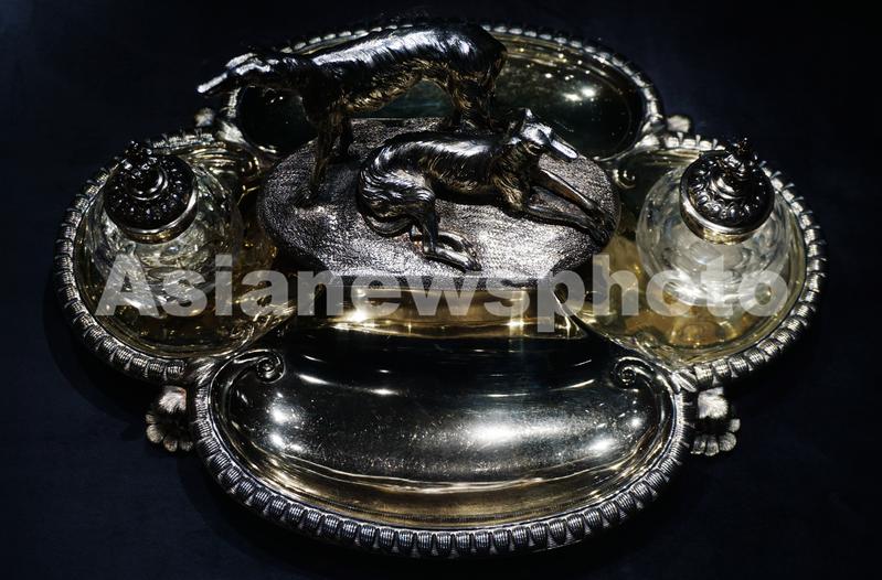 2023年3月18日,在“西方18-20世纪银器展”上拍摄到的维多利亚时代的《银镀金墨水架》。