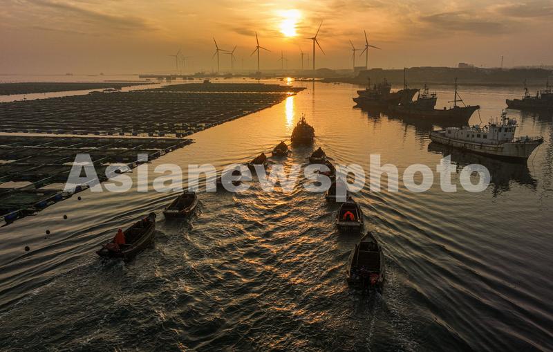 图片说明:2023年3月19日,在山东省荣成市桑沟湾海洋牧场,渔民们驾驶渔船前往生态养殖区进行作业。