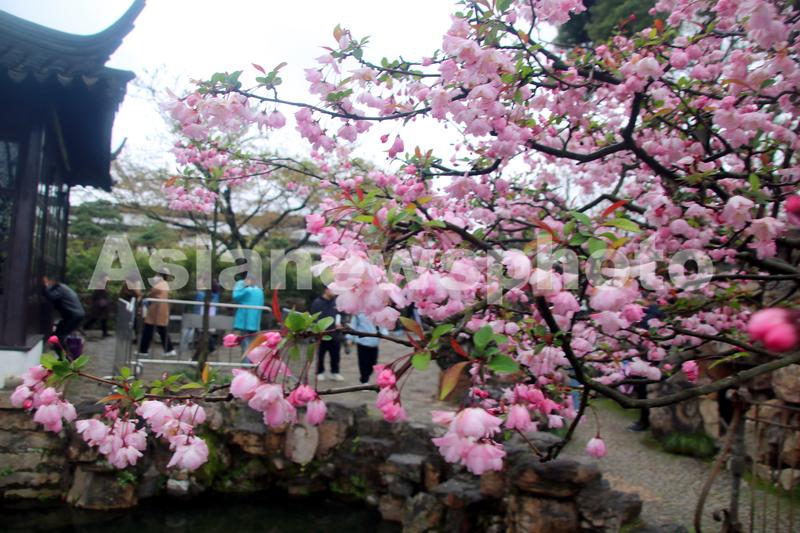 2023年3月17日,游人在海棠花盛开的江苏苏州古典园林拙政园游览。当日,江苏苏州古典园林拙政园内的海棠花盛开,吸引众多游客前来观赏。