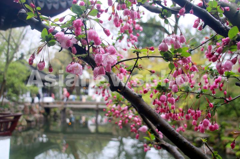 2023年3月17日,游人在海棠花盛开的江苏苏州古典园林拙政园游览。当日,江苏苏州古典园林拙政园内的海棠花盛开,吸引众多游客前来观赏。