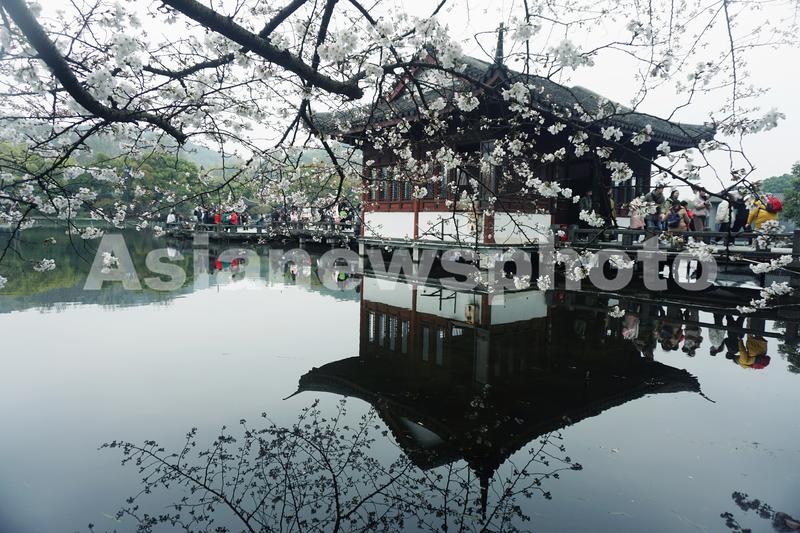 图片说明:2023年3月19日,游客观赏杭州西湖边盛开的樱花。