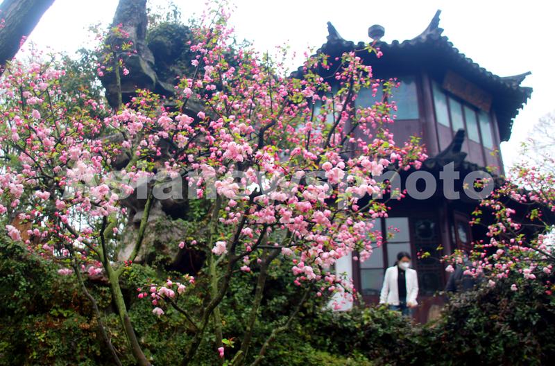 2023年3月17日,游人在海棠花盛开的江苏苏州古典园林拙政园游览。当日,江苏苏州古典园林拙政园内的海棠花盛开,吸引众多游客前来观赏。
