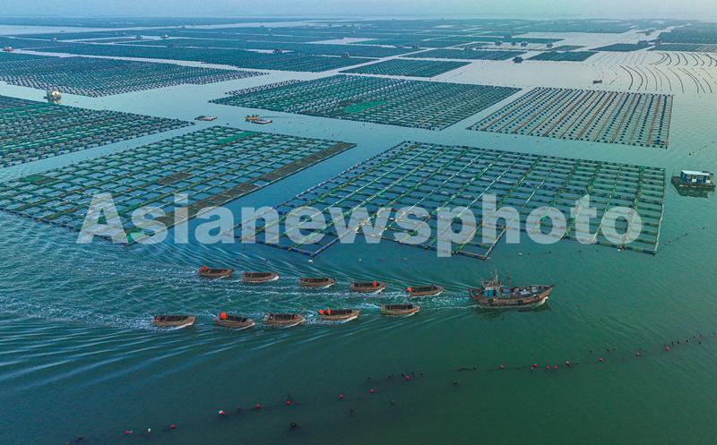 图片说明:2023年3月19日,在山东省荣成市桑沟湾海洋牧场,渔民们驾驶渔船前往生态养殖区进行作业。