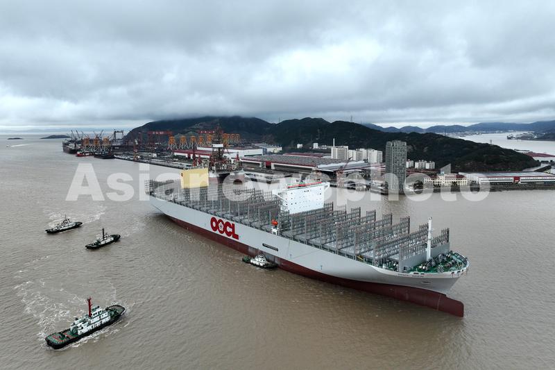图片说明:2023年3月17日下午傍晚,中国香港籍“东方西班牙”集装箱轮在4艘拖轮的协助下,驶离浙江省舟山市岱山县金海船厂码头,这标志着又一艘全球最大装箱量之一的集装箱船在舟山正式交付投用(无人机照片)。注:(2023年3月11日“MSC IRINA”集装箱轮在舟山交付投用)