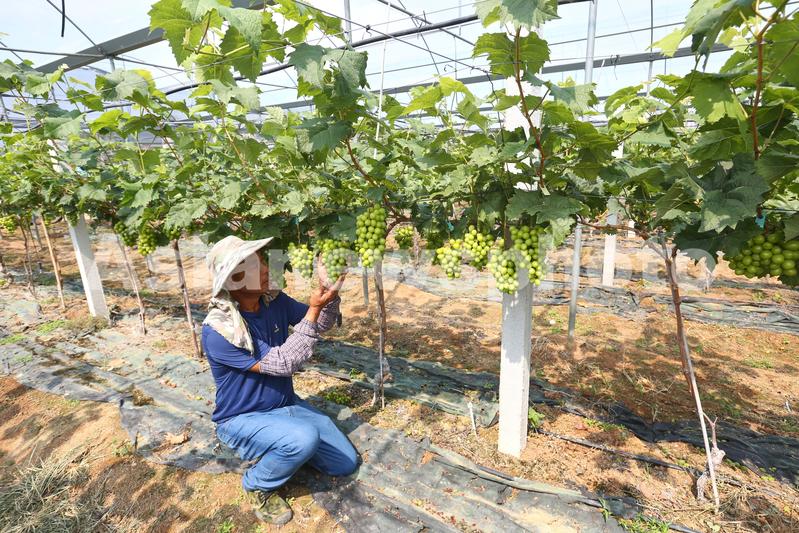 3月17日,果农在海南省三亚市吉阳区安罗村葡萄园查看“阳光玫瑰”葡萄长势。