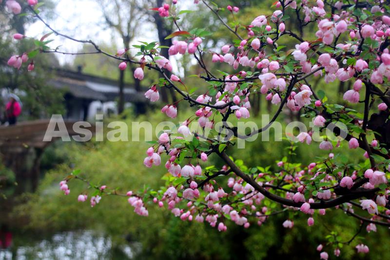 2023年3月17日,游人在海棠花盛开的江苏苏州古典园林拙政园游览。当日,江苏苏州古典园林拙政园内的海棠花盛开,吸引众多游客前来观赏。