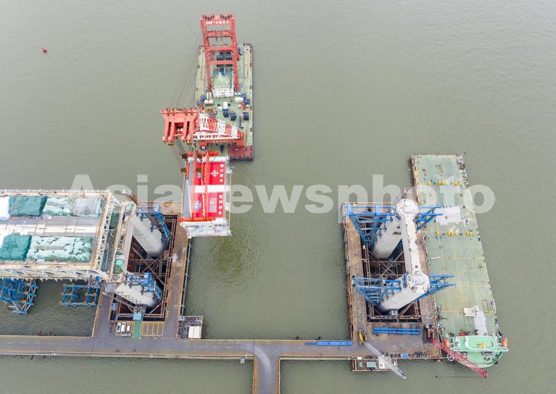 2023年3月20日,中交二航局建设者在常泰长江大桥主航道桥泰州侧施工现场进行首节段钢桁梁架设(无人机照片)。