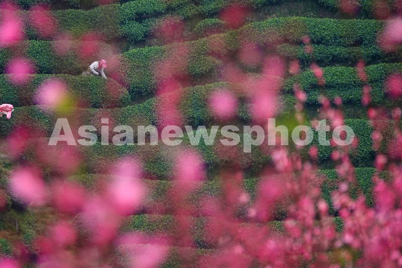 2023年3月21日,当日是二十四节气中的春分,广西贺州市昭平县南山上千亩高山生态茶园桃红柳绿、山花浪漫、烟雨朦胧,上百名茶农上山赶采春茶忙。