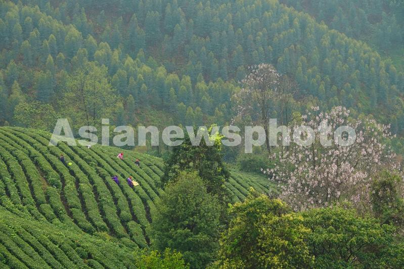 2023年3月21日,当日是二十四节气中的春分,广西贺州市昭平县南山上千亩高山生态茶园桃红柳绿、山花浪漫、烟雨朦胧,上百名茶农上山赶采春茶忙。