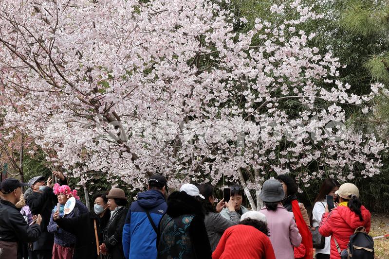 图片说明:3月23日,游客在玉渊潭公园赏樱拍照。