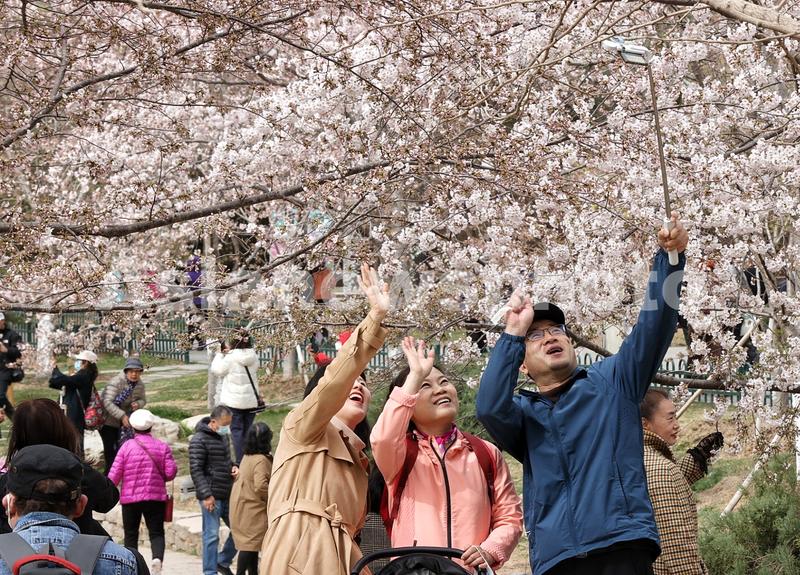 图片说明:3月23日,游客在玉渊潭公园赏樱拍照。