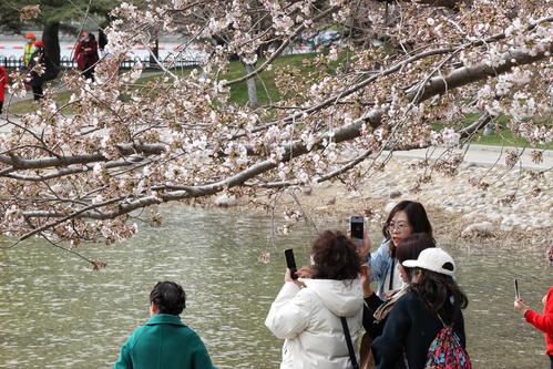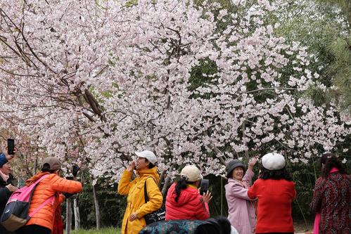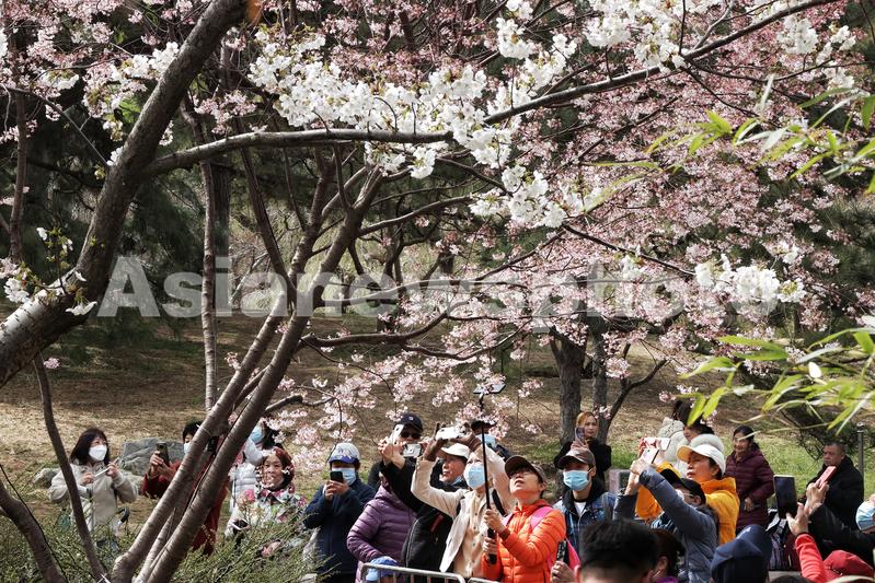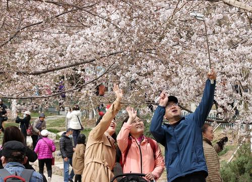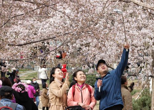 图片说明:3月23日,游客在玉渊潭公园赏樱拍照。