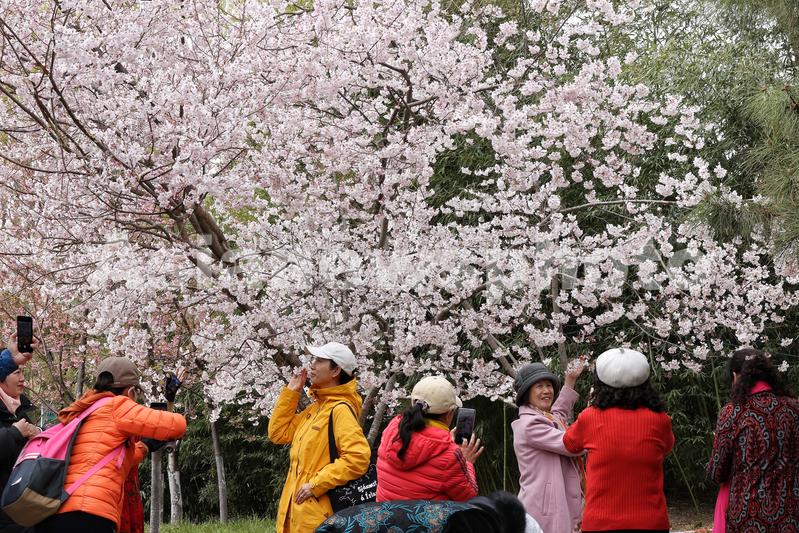 图片说明:3月23日,游客在玉渊潭公园赏樱拍照。
