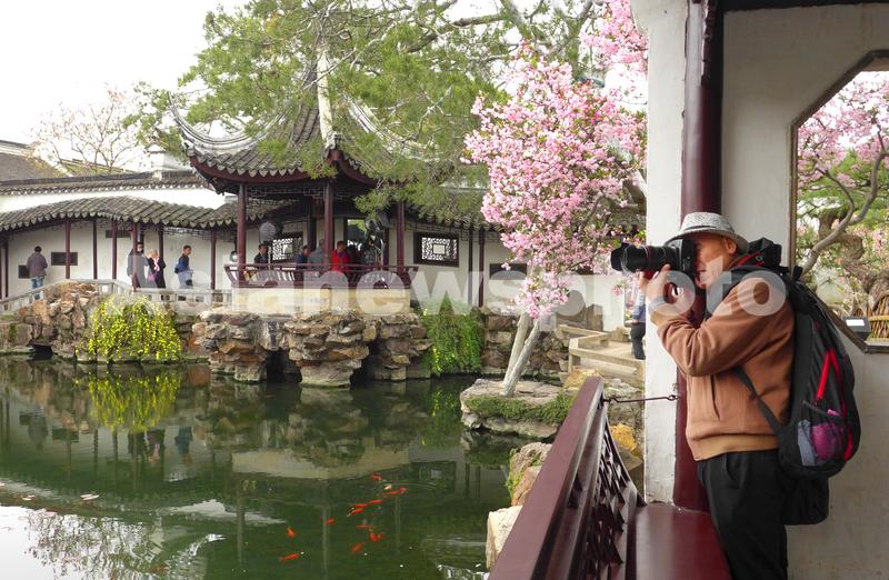 2023年3月24日,春分时节,苏州古典园林网师园彩霞池旁的几株海棠老桩,满枝花蕾,竞相绽放,为春日古园增添一抹迷人靓色,吸引许多游客驻足赏花,或拍照留影。
