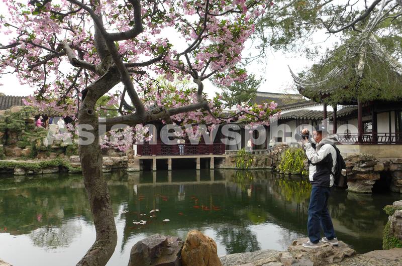 3月24日,游人在苏州古典园林网师园彩霞池旁拍摄海棠花开景致。