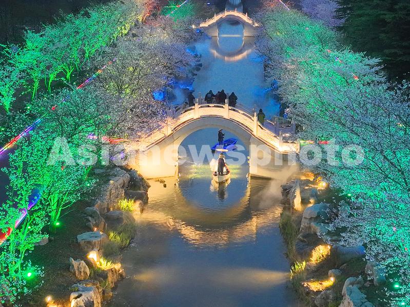 2023年3月23日晚在江苏省南通市通州区五接镇拍摄的梦幻岛樱花河畔亮灯美景。
