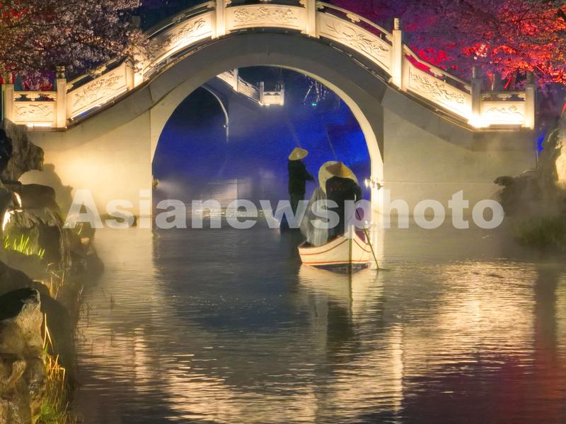 2023年3月23日晚在江苏省南通市通州区五接镇拍摄的梦幻岛樱花河畔亮灯美景。