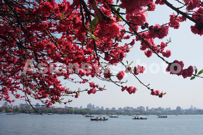 图片说明:2023年3月27日,游客乘坐游船观赏杭州西湖白堤上盛开的桃花。