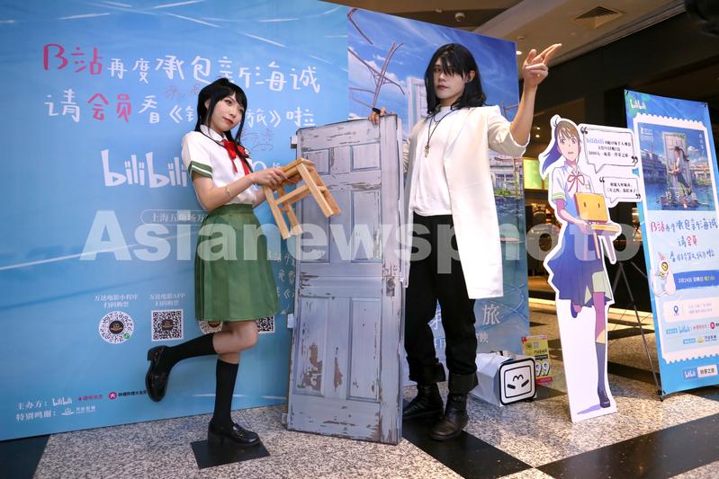 2023年3月24日,上海,哔哩哔哩弹幕网站(B站)举办新海诚动画电影新作《铃芽之旅》的线下观影活动,男女主角的COSPLAY在电影院借助道具进行角色扮演。