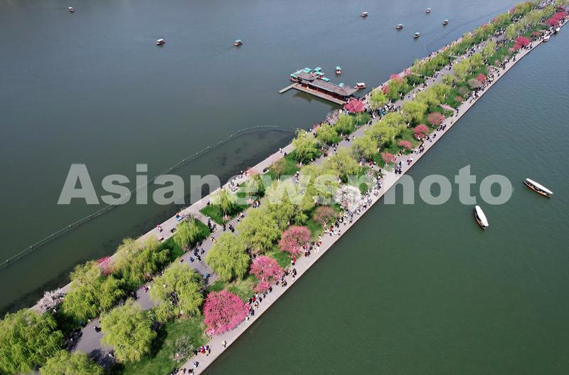 图片说明:2023年3月27日,游客在杭州西湖白堤上游览观赏“间株杨柳间株桃”的美景。