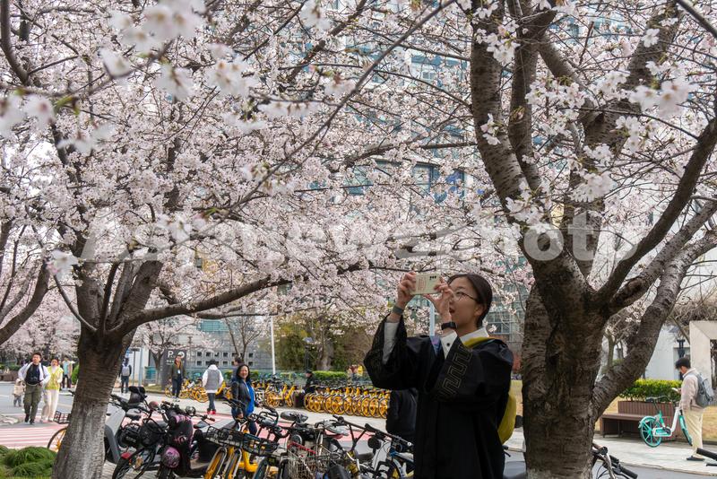 2023年3月25日,上海同济大学爱校路上的樱花盛开,美丽的风景吸引众多师生和游客赏花。