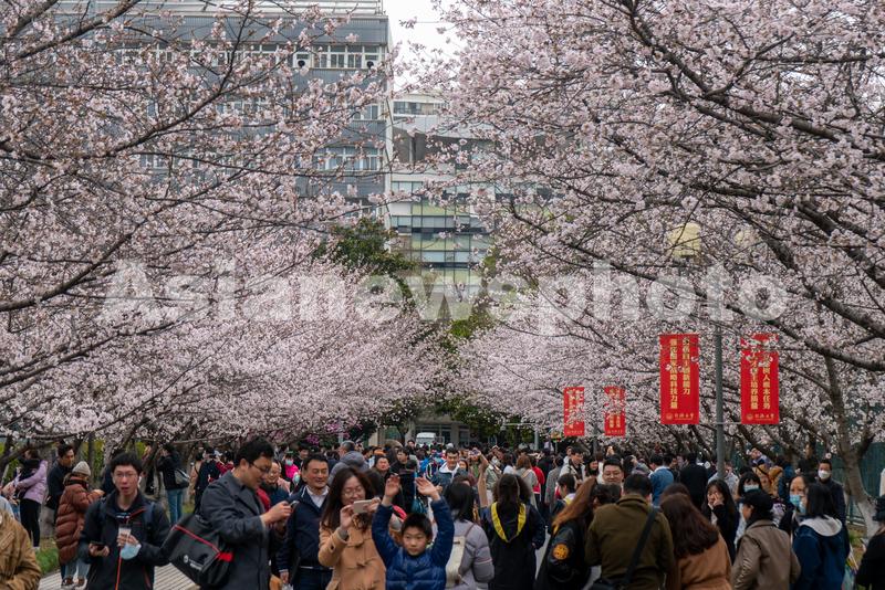 2023年3月25日,上海同济大学爱校路上的樱花盛开,美丽的风景吸引众多师生和游客赏花。