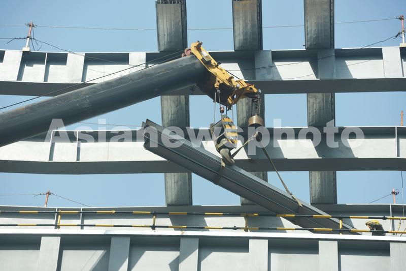 图片说明:2023年3月26日,工人在杭州国际博览中心二期现场进行施工。