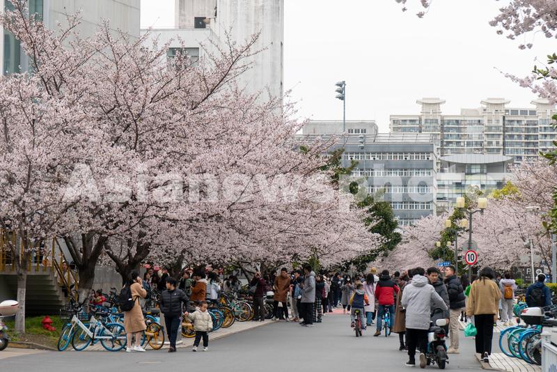 2023年3月25日,上海同济大学爱校路上的樱花盛开,美丽的风景吸引众多师生和游客赏花。