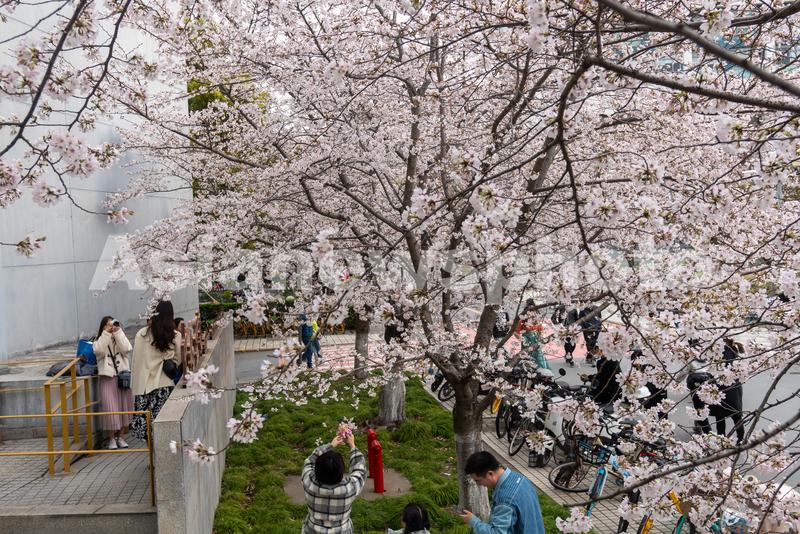 2023年3月25日,上海同济大学爱校路上的樱花盛开,美丽的风景吸引众多师生和游客赏花。