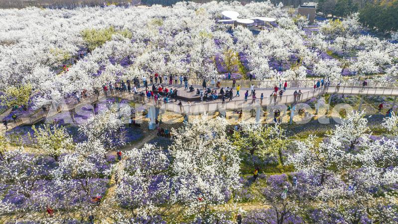 图片说明:2023年3月27日,游人在宿迁市三台山国家森林公园的梨兰会景区赏花(无人机照片)。