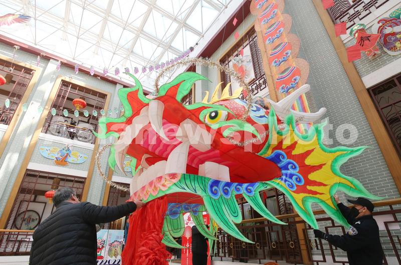 2023年3月28日,在山东潍坊世界风筝博物馆,工作人员正在悬挂巨型龙头风筝。