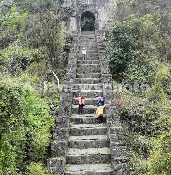图片说明:2023年3月23日,游客在贵州省遵义市汇川区海龙屯三十六步天梯游玩。