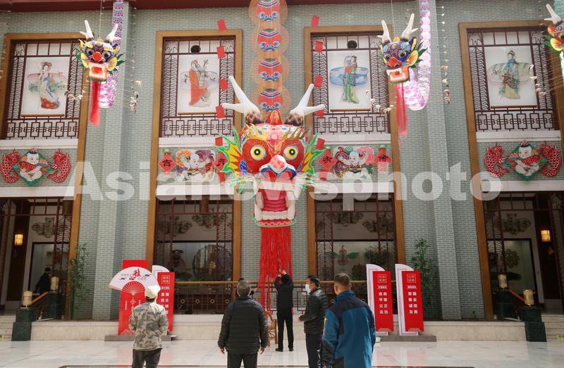 2023年3月28日,在山东潍坊世界风筝博物馆,工作人员正在悬挂巨型龙头风筝。
