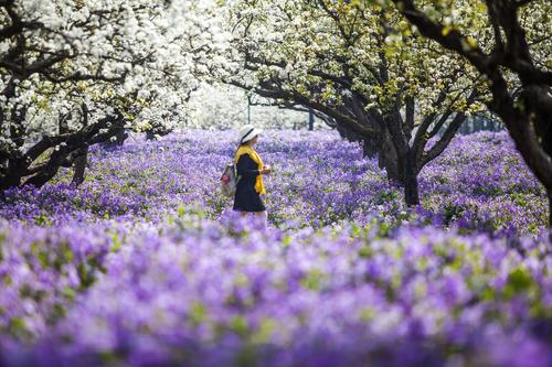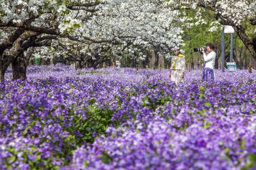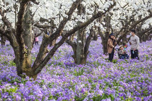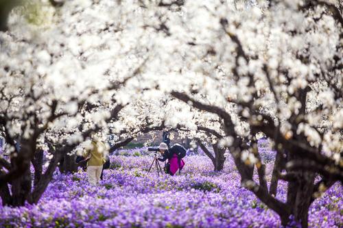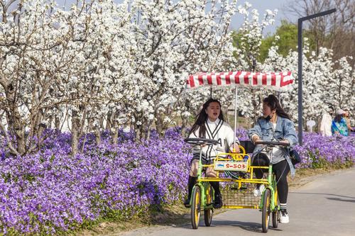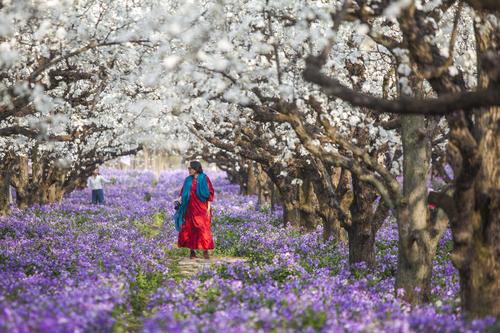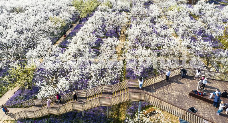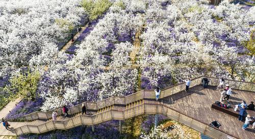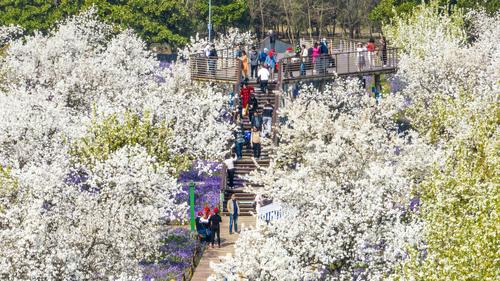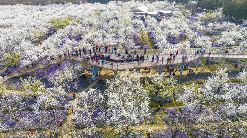 图片说明:2023年3月28日,游人在宿迁市三台山国家森林公园的梨兰会景区赏花(无人机照片)。