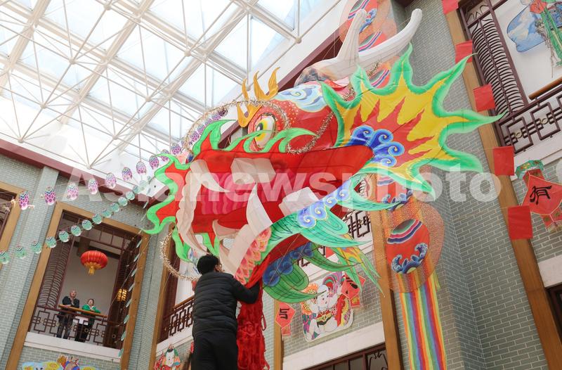 2023年3月28日,在山东潍坊世界风筝博物馆,工作人员正在悬挂巨型龙头风筝。